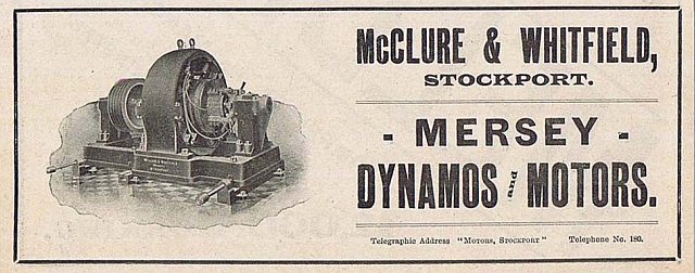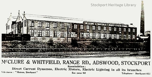 ![]() The Mersey Dynamo Works shortly before demolition. BeginningsIn 1892 Robert Brotherton Whitfield, son of a schoolteacher from Northumberland, joined forces, to manufacture electrical dynamos and motors, with David McClure, whose father (also David) was the owner of Travis Brook cotton-spinning mill in Stockport, Both men had served an apprenticeship as electrical engineers in the Manchester area where they met; where they worked is not known, but a likely choice would be the Salford factory of Mather and Platt, who in 1883 obtained the rights to a dynamo being produced in the USA by the Edison, company, and developed their own improved version. The two workmates, both in their early twenties, called their company McClure and Whitfield. It appears from directories that they obtained premises in Lower Wellington Mill (also known as Wellington Bridge Mill), which stood on Heaton Lane, Stockport, on the banks of the river Mersey. Perhaps this location inspired the name 'Mersey Dynamo Works'. (The building was demolished in 1973 and replaced by an office block called 'Regent House' which in 2020 houses a Travelodge hotel. Some sources confuse this mill with Wellington Mill, the large building which now houses the Hat Works museum.) Range Road![]() Advertisment from c.1905The Mersey Dynamo Works was clearly a success, with demand at the time from factories, and even large houses, wanting to use electricity before the days of the National Grid. After a few years the partners were able to commission their own building, on land between the London and North Western Railway company's main line near Stockport Edgeley station, and a newly-created street, Range Road. ![]() From map evidence the building appears to date from around 1902; it was a close neighbour of Woodrow's hat works, which also proclaimed its name to passing rail travellers, and has also since been replaced by a housing development. ![]() From Stockport Yearbook, 1928.